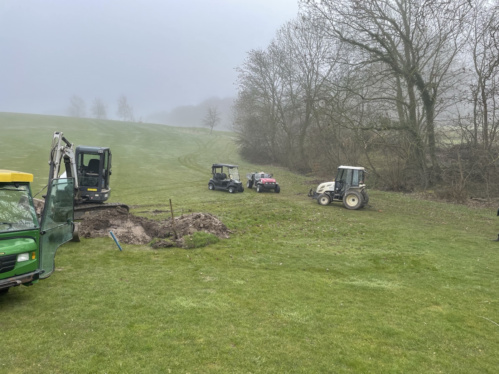 Es musste ein Drainagerohr in der Senke am Waldrand auf Bahn 10 erneuert werden. es war verstopft. Dieser Bereich wird blau gesteckt.