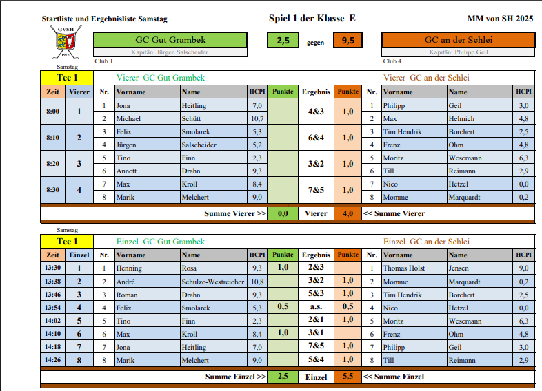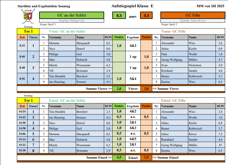 Im entscheidenden Einzelteil zeigte das Team nochmals seine ganze Klasse. Borchert eröffnete mit einem klaren 4&2, Geil (4&3) und Helmich (6&5) bauten die Führung aus. Jan Henning Siemen zeigte anschließend eine bärenstarke Leistung, teilte sein Match auf der 18 – bei beeindruckenden 12 Birdies in seiner Partie. Den entscheidenden Punkt zum Sieg holte Nico Hetzel mit einem 2&1-Erfolg. Wesemann (2&1) gewann ebenfalls, Marquardt und Reimann teilten ihre Matches. Endstand: 8,5:3,5 – der GC an der Schlei steigt damit verdient in die Klasse D auf.