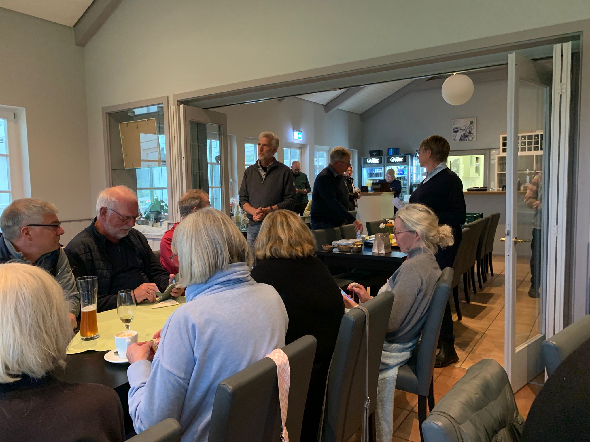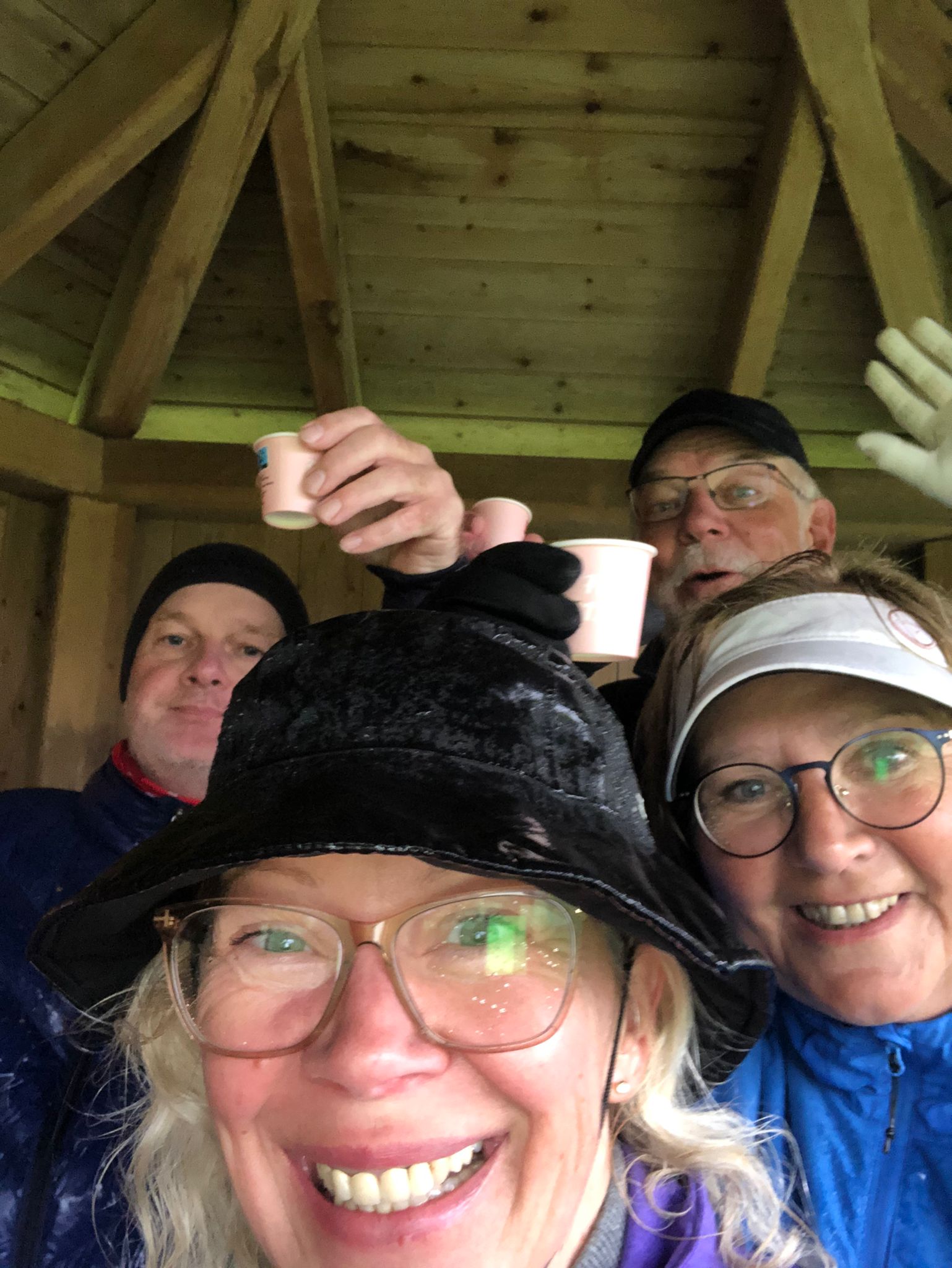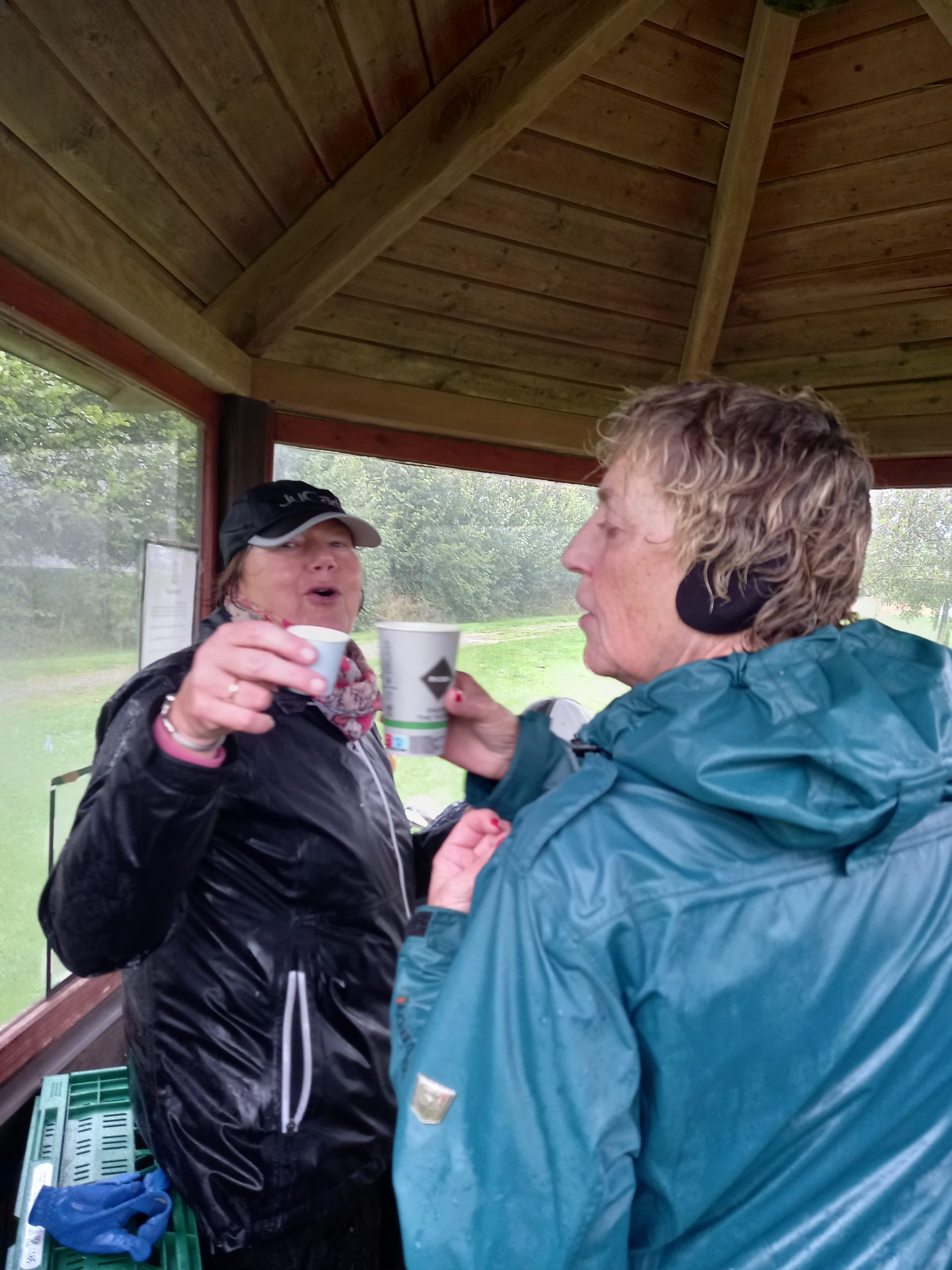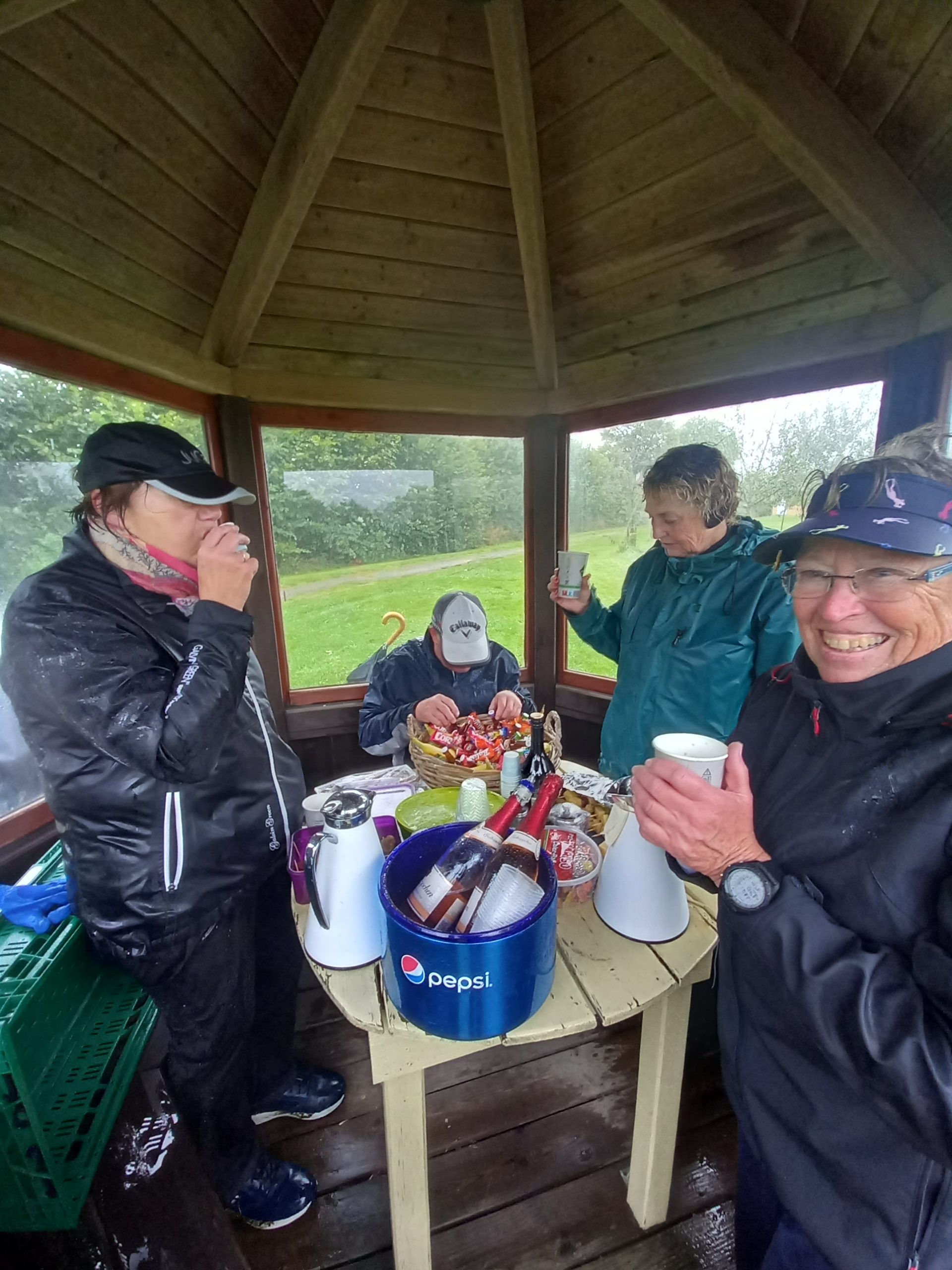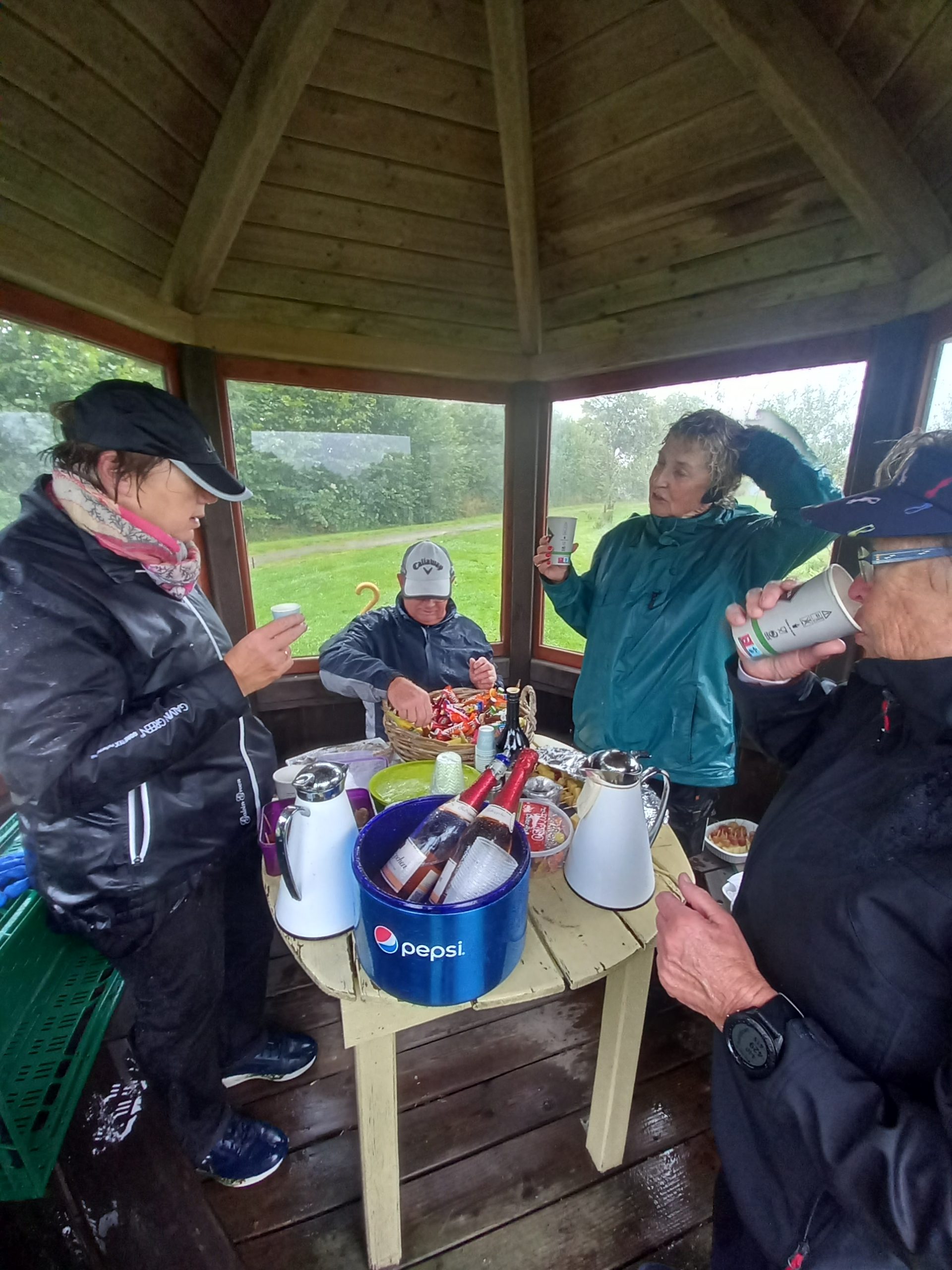 In der Hütte am Abschlag 10 fanden die durchnässten Teilnehmer schließlich eine wohlverdiente Pause. Die Damen hatten vorgesorgt und eine köstliche Verpflegung für die Herren vorbereitet. Heiße Getränke wie Glühwein und Baileys sowie prickelnder Sekt halfen, die Kälte zu vertreiben und die Gemüter zu erhellen. Die herzliche Atmosphäre in der Hütte ließ die Strapazen des Spiels schnell in Vergessenheit geraten, und das gesellige Beisammensein stand nun im Mittelpunkt.