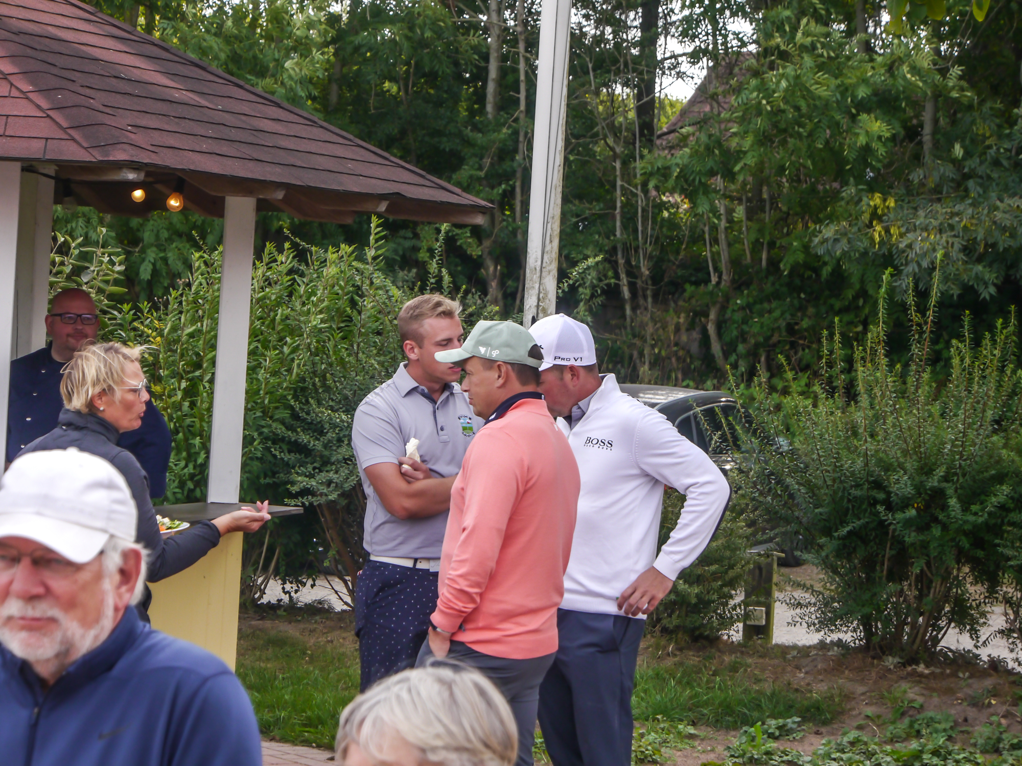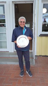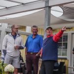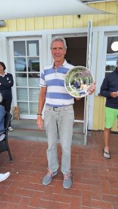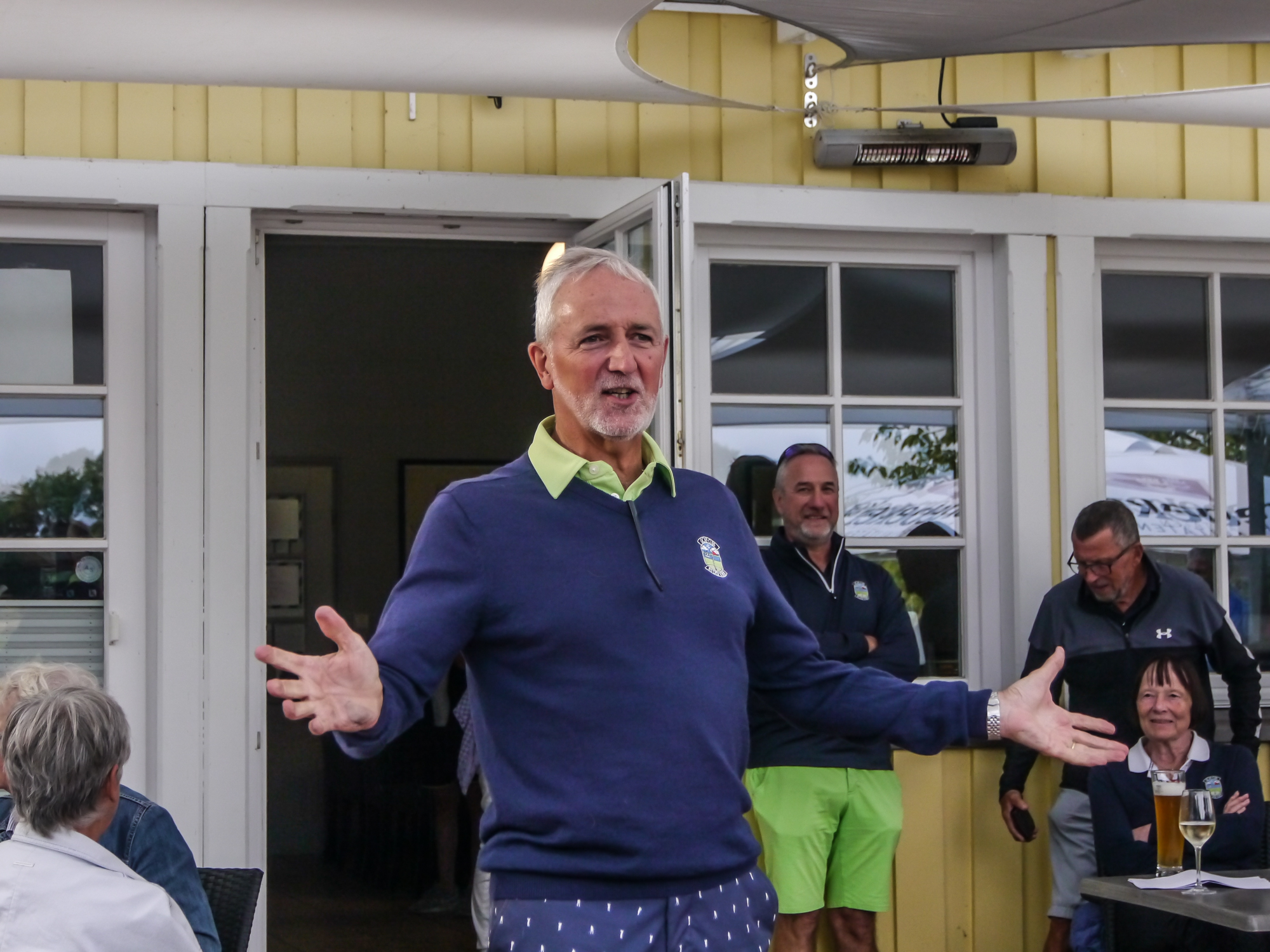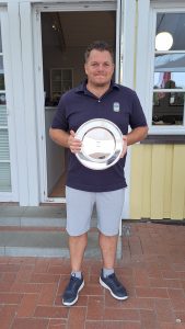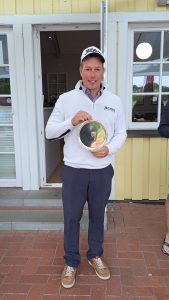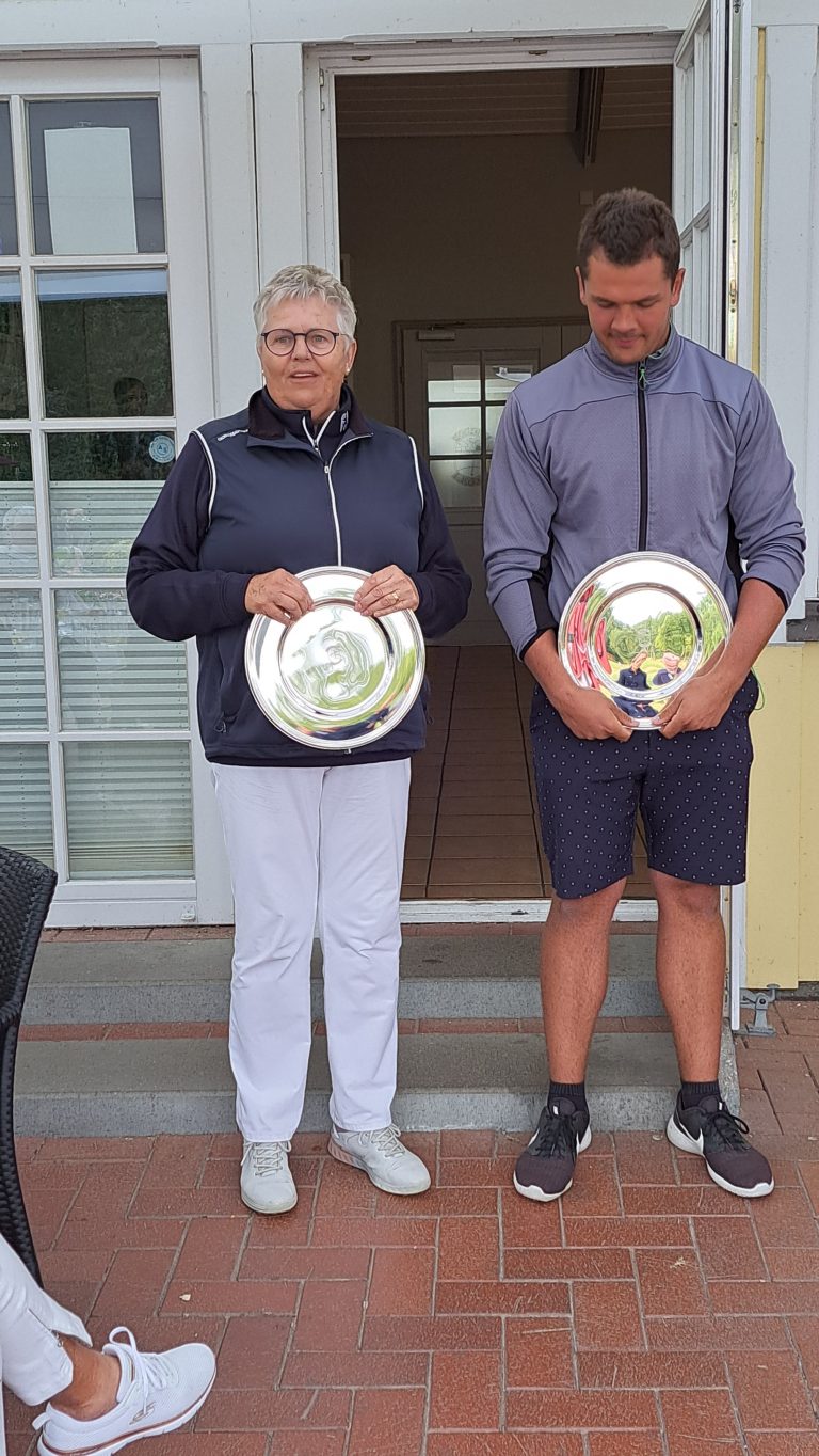 Alle Sieger und Platzierte Namen voller Stolz ihre Teller und Medaillen vom Spielführer entgegen. Nico Hetzel bat Mette Jensen für die Siegerrede mit nach vorne. Mette dankte ihrem Flight für die angenehmen Runden und dem Greenkeepern für den tollen Platz, trotz der anhaltenden Trockenheit. Sie freute sich für Nico und sagte, dass der Club stolz und glücklich sein könne, so ein Talent aus den eigenen Reihen hervorgebracht zu haben. Nico ließ in seiner Dankesrede weder seinen Flight, seine Familie noch die Greenkeeper aus. Ein ganz besonderen Dank wollte der Youngstar aber auch noch loswerden. Er dankte im Namen der Herrenmannschaften Philipp Geil für sein Engagement. Ohne ihn wäre eine solche Truppe und die jetzt erzielten Erfolge nicht möglich gewesen. Philipps Beharrlichkeit hatte viele Spieler der Oberligamannschaft erst davon überzeugt, Mitglied unseres Clubs zu werden und damit den Grundstein für die Erfolge gelegt.