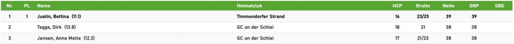 Nach 18 Löchern setzte sich in der Brutto-Wertung eine Gastspielerin aus Timmendorfer Strand durch. Bettina Justin sicherte sich mit 8 Par und 23 Bruttopunkten die 1. Position. Dirk Tegge belegte den 2. Platz vor Anne Mette Jensen.