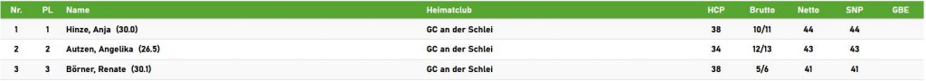 Die Netto-Wertung sicherte sich Anja Hinze. Mit 44 Netto Punkten setzte sie sich knapp gegen Angelika Autzen und Renate Börner durch. Anja´s Highlight war dabei sicher das Birdie auf der 17. Well done.