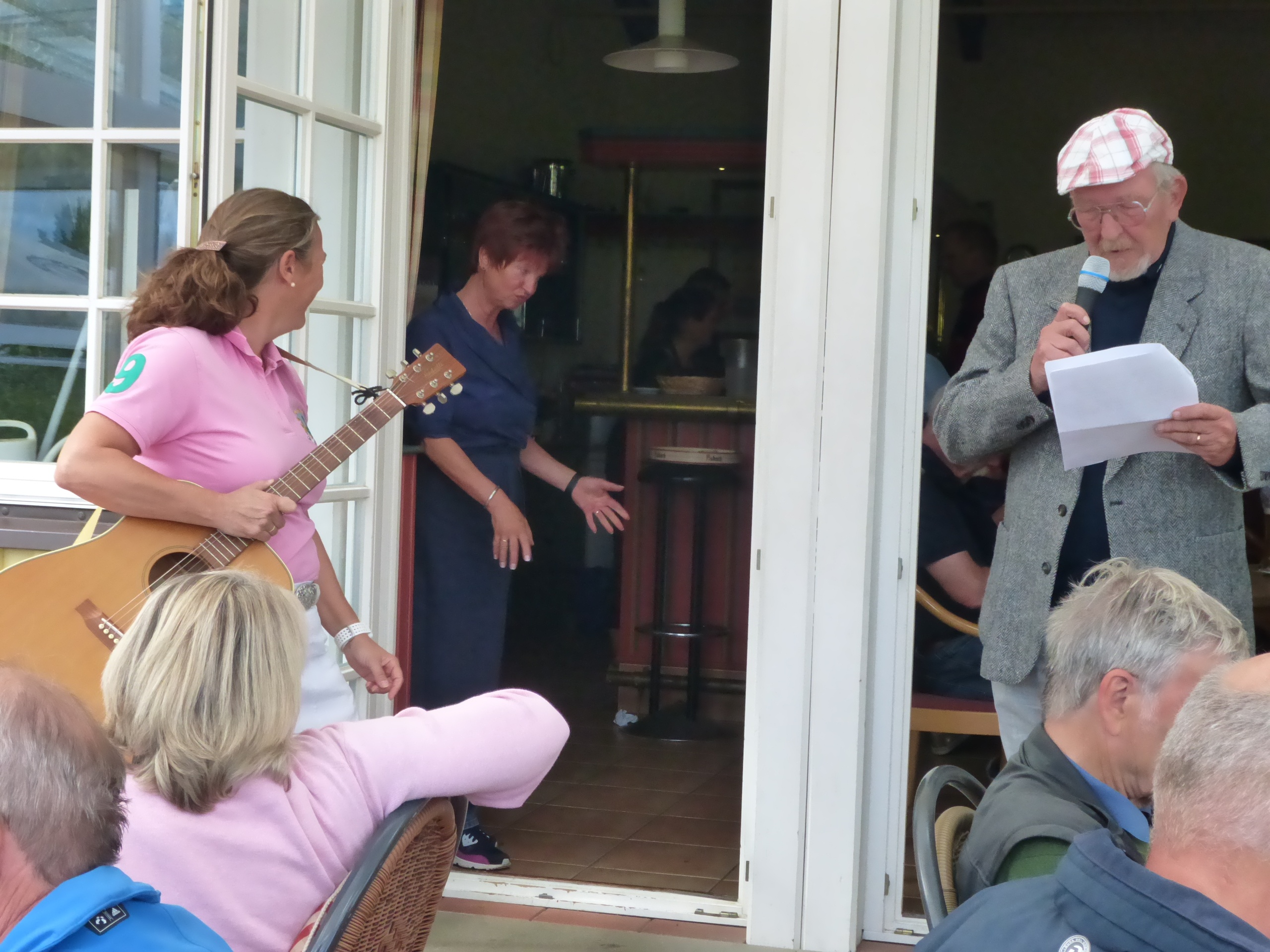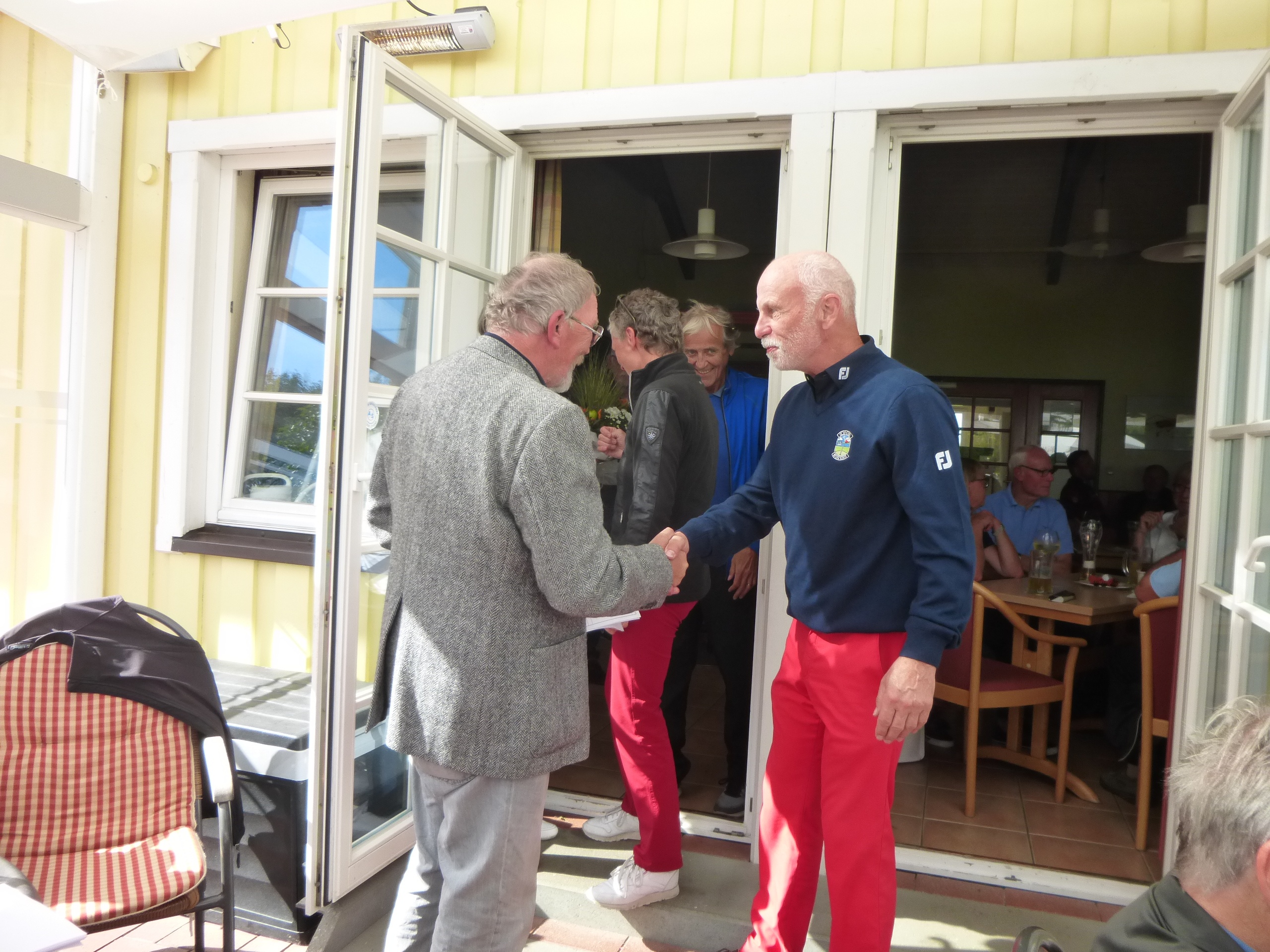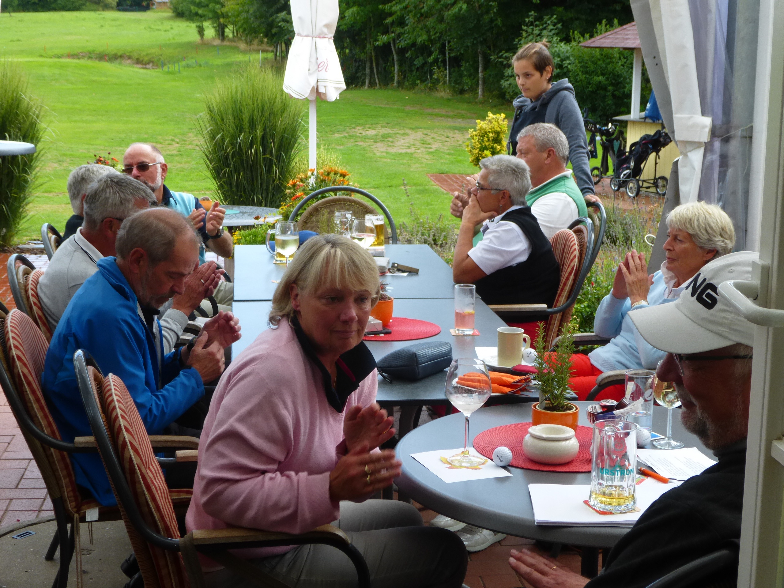 Wenn der Präsident ruft, und das zum 10. Mal, ist die Anmeldeliste schnell gefüllt. Nur mit dem Wettergott stand er in diesem Jahr nicht auf einem guten Fuß. Drei kurze und heftige Regengüsse, die zum nass werden reichten, gingen auf die Spieler nieder. Die allerdings ließen sich die Laune nicht verderben. Wurde doch ein Texasscramble zu viert gespielt und das mit Partnern, die man sich aussuchen konnte. Solche Turniere spielt man dann doch gerne. Fröhlich, mit guten Ergebnissen kamen die Spieler wieder im Loch 19 an, wo schon das leckere Essen, das Gudrun Raschke mit ihrem Team servierten, wartete.