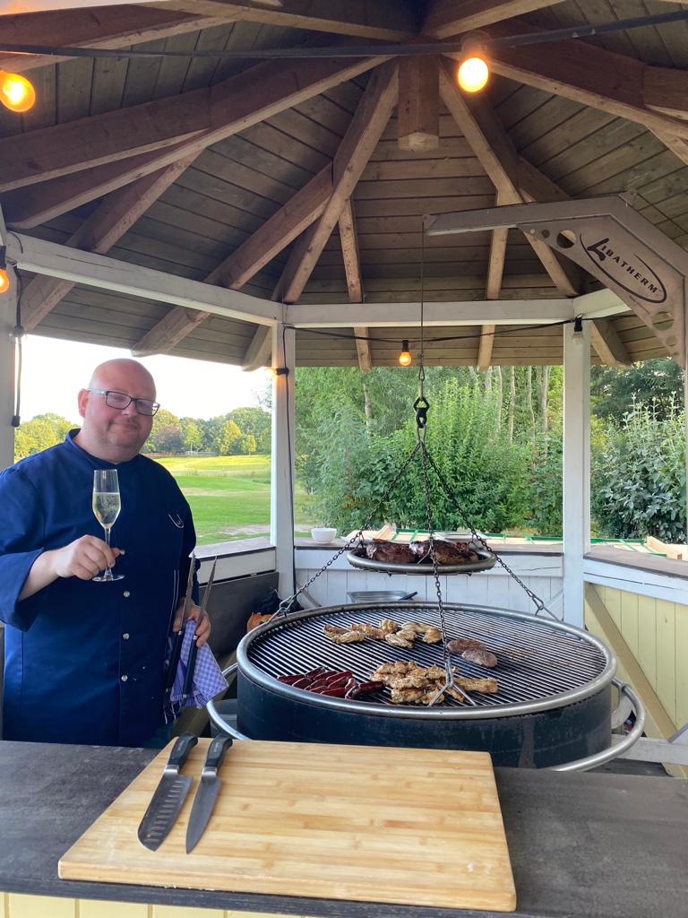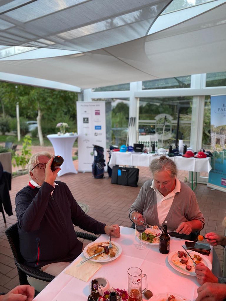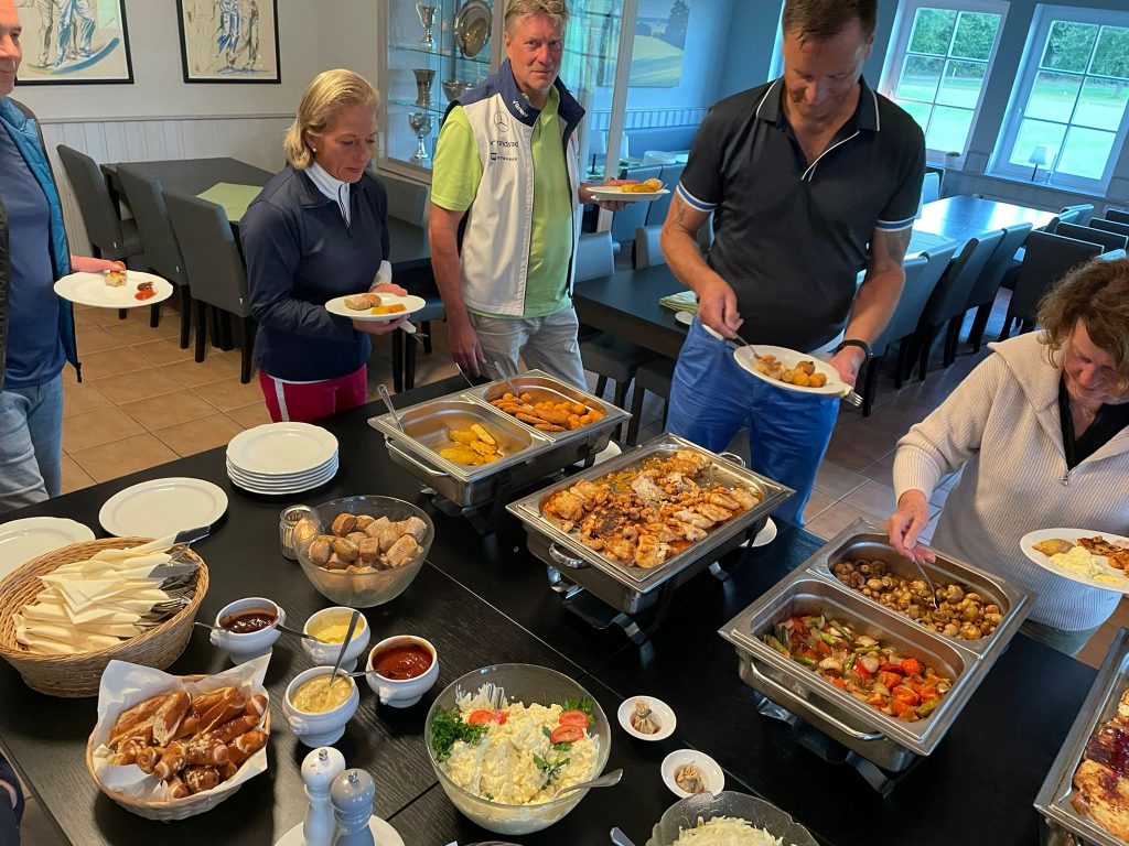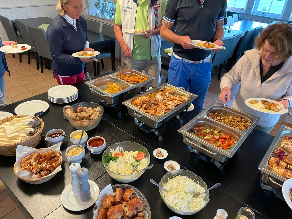Bei der Rückkehr von der Runde wurden die Teilnehmer vom Pro und seiner Familie mit einem Gläschen empfangen. Während der Runde hatte unser Koch für alle ein fantastisches Essen gezaubert. Es gab Barbeque. Rumpsteak, Chicken, Lachs und Garnelen. Dazu hatte er allerei Salate, Dips und Brot aufgetischt. Nicht nur ein toller Anblick, sondern auch ein Gaumenschmaus.