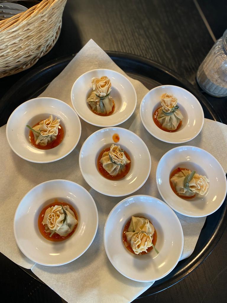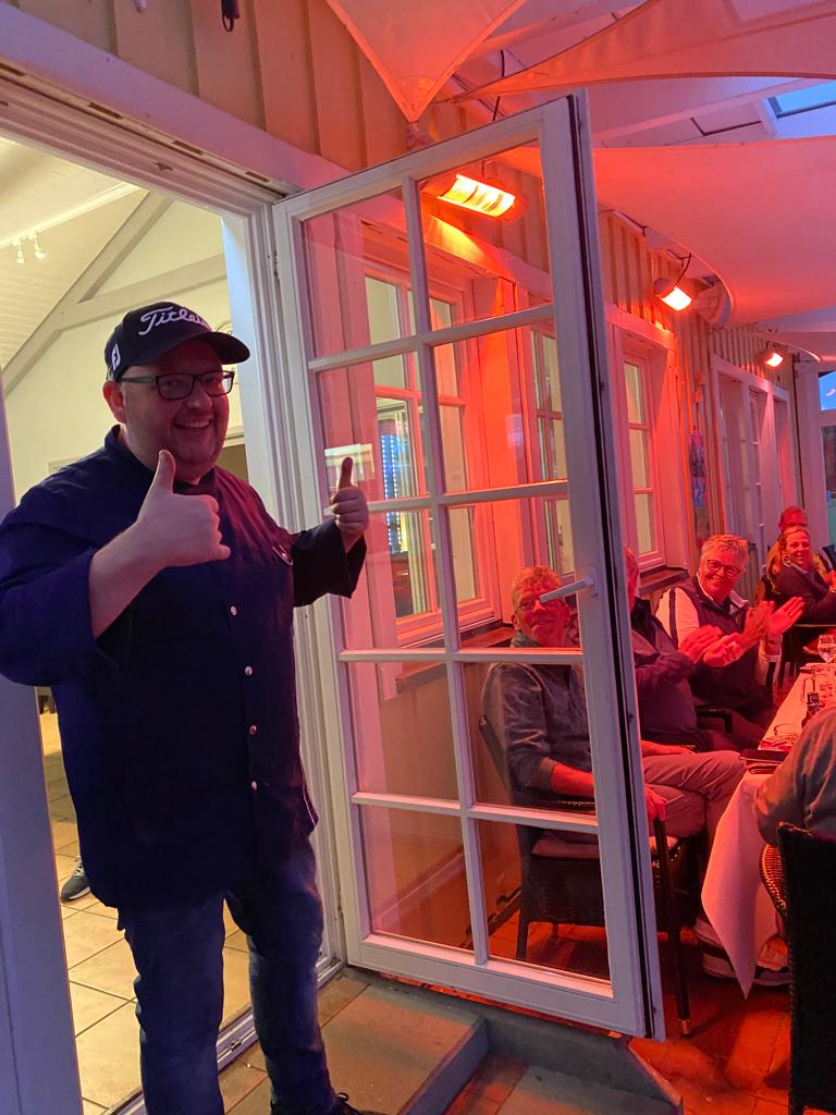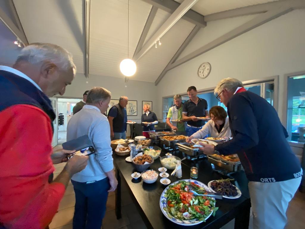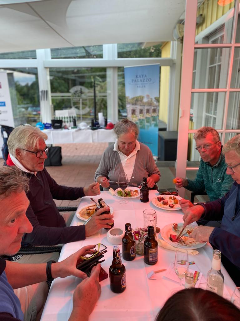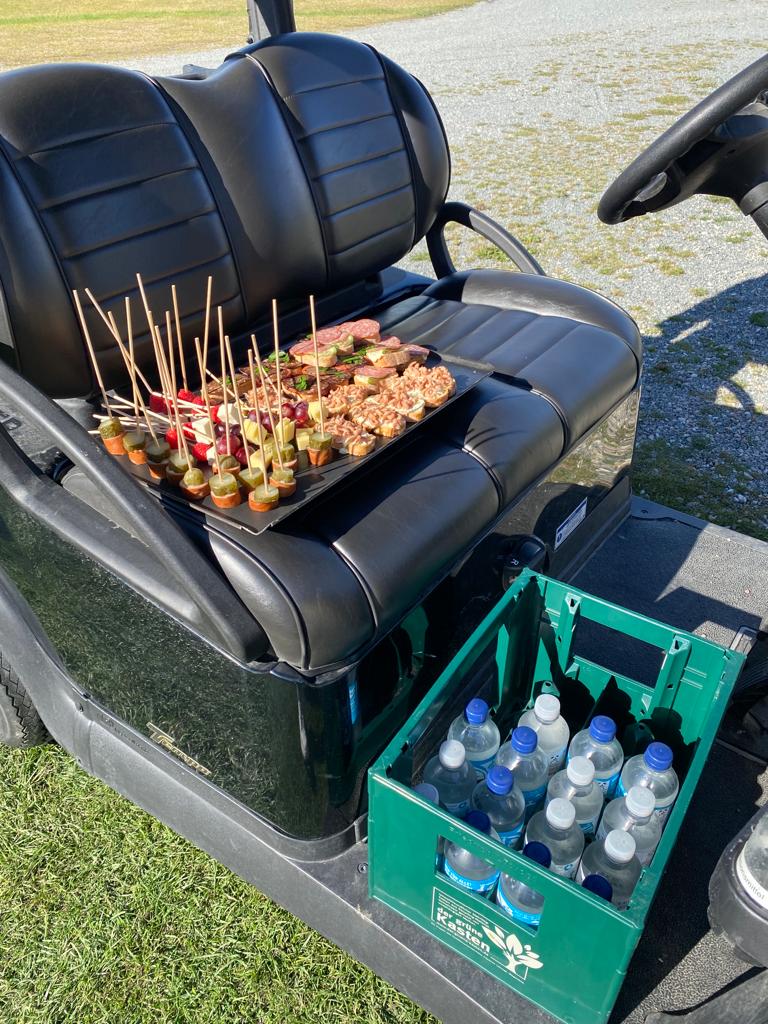 Bei der Rückkehr von der Runde wurden die Teilnehmer vom Pro und seiner Familie mit einem Gläschen empfangen. Während der Runde hatte unser Koch für alle ein fantastisches Essen gezaubert. Es gab Barbeque. Rumpsteak, Chicken, Lachs und Garnelen. Dazu hatte er allerei Salate, Dips und Brot aufgetischt. Nicht nur ein toller Anblick, sondern auch ein Gaumenschmaus.