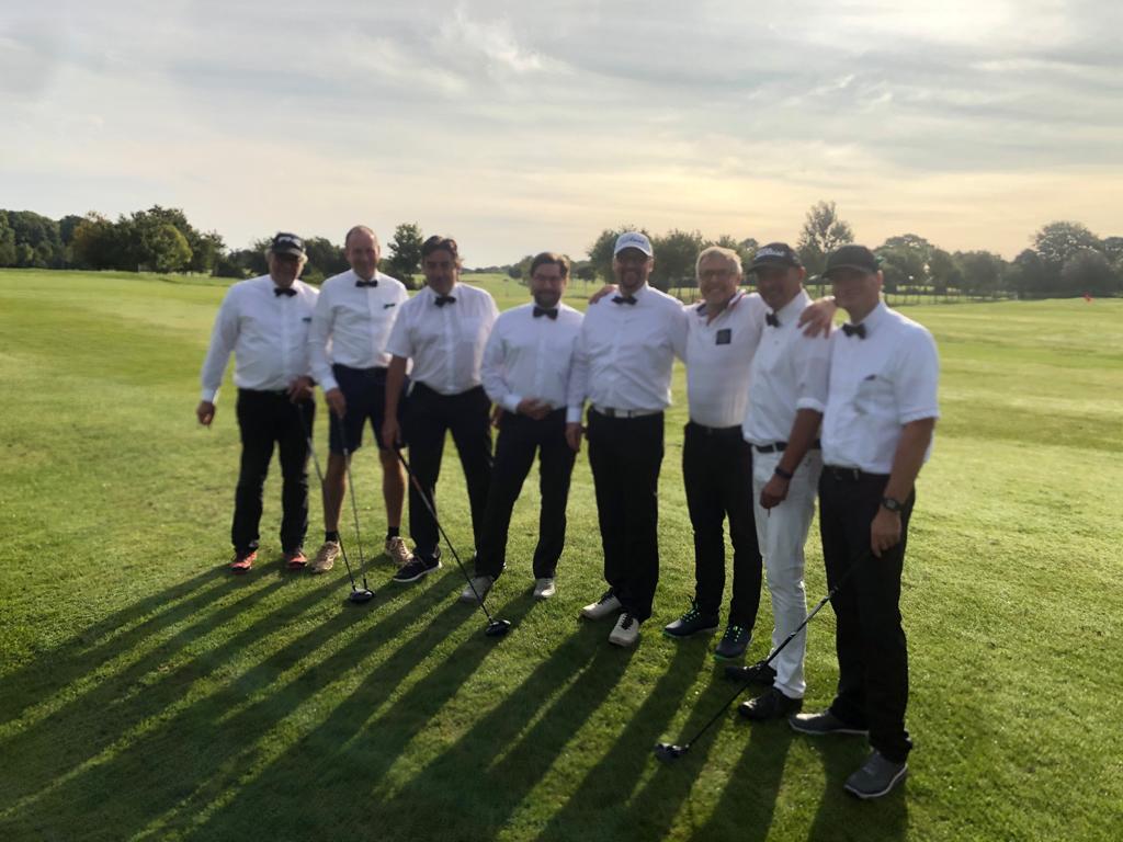8 Herren aus beiden Gilden hatten sich zum Lochspiel auf unserem Golfplatz verabredet. Natürlich trugen die Herren dabei ihre gewohnte Kleidung und es fehlte auch die Fliege nicht.