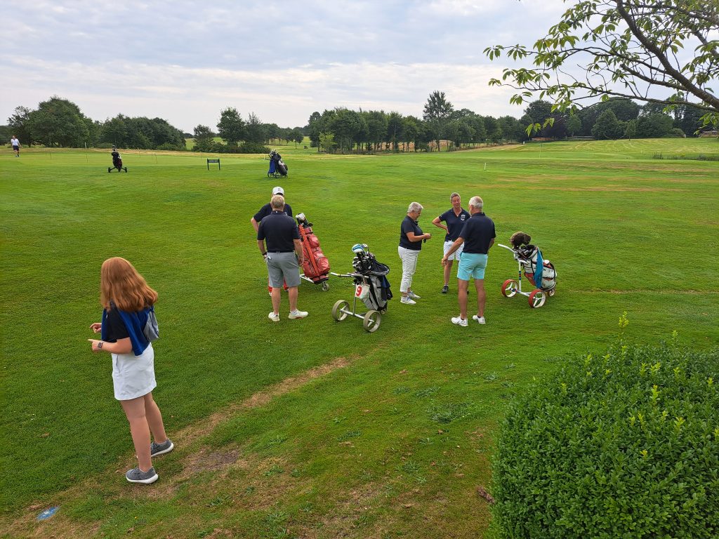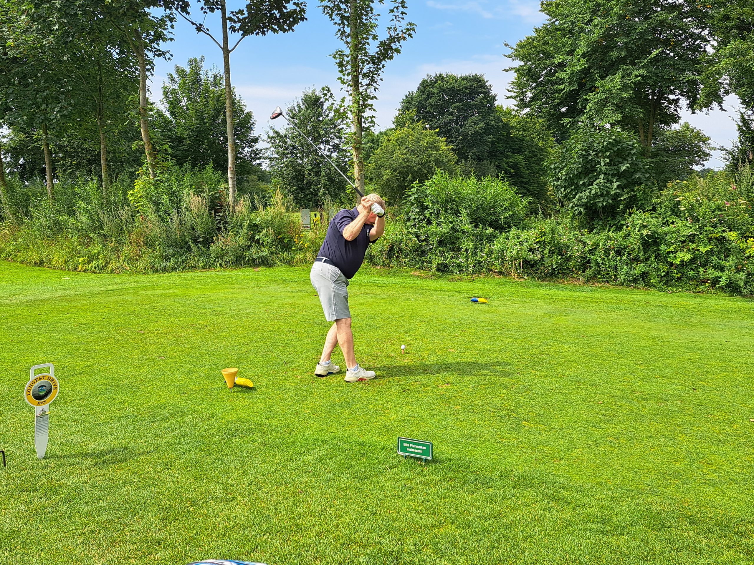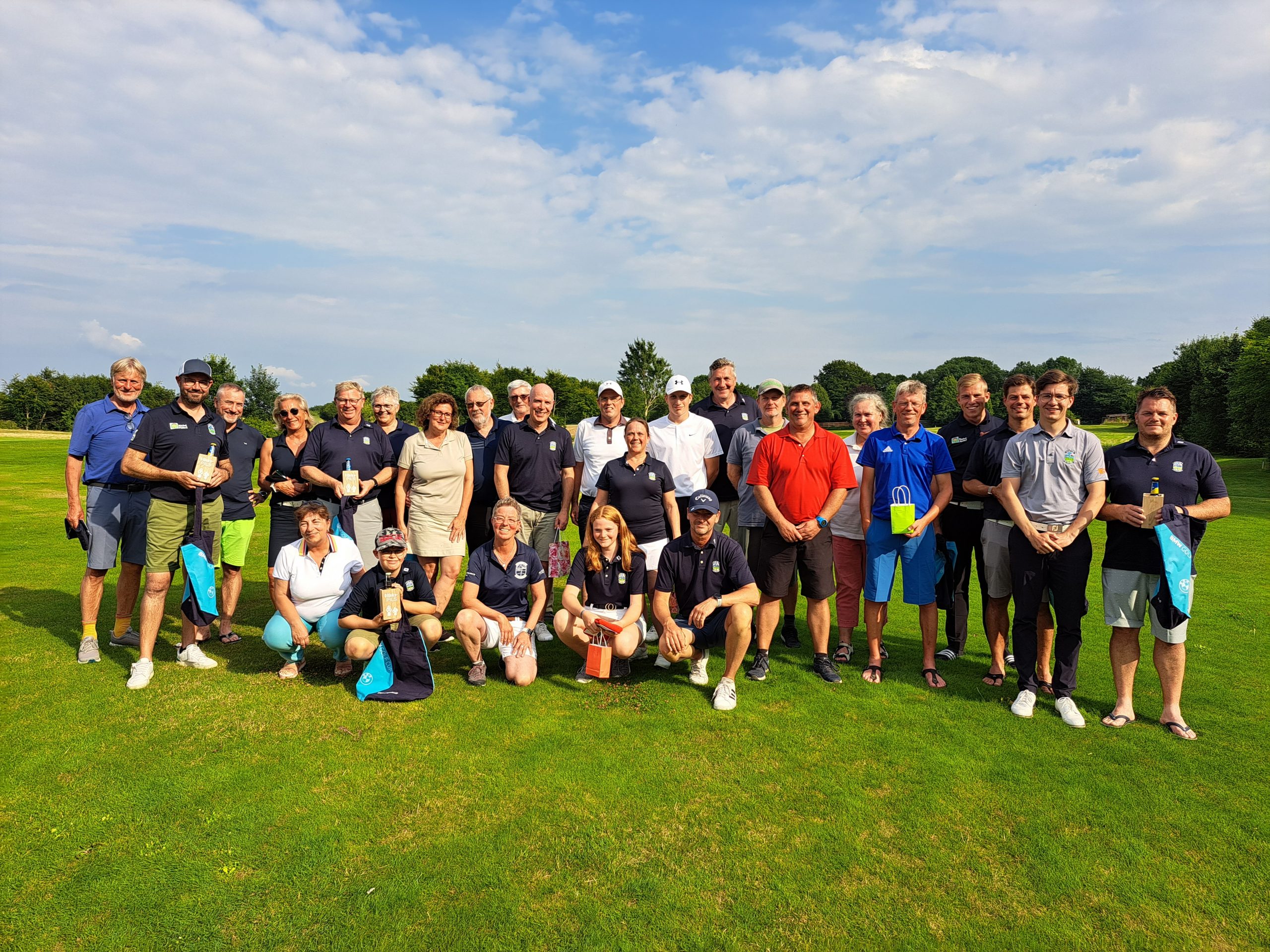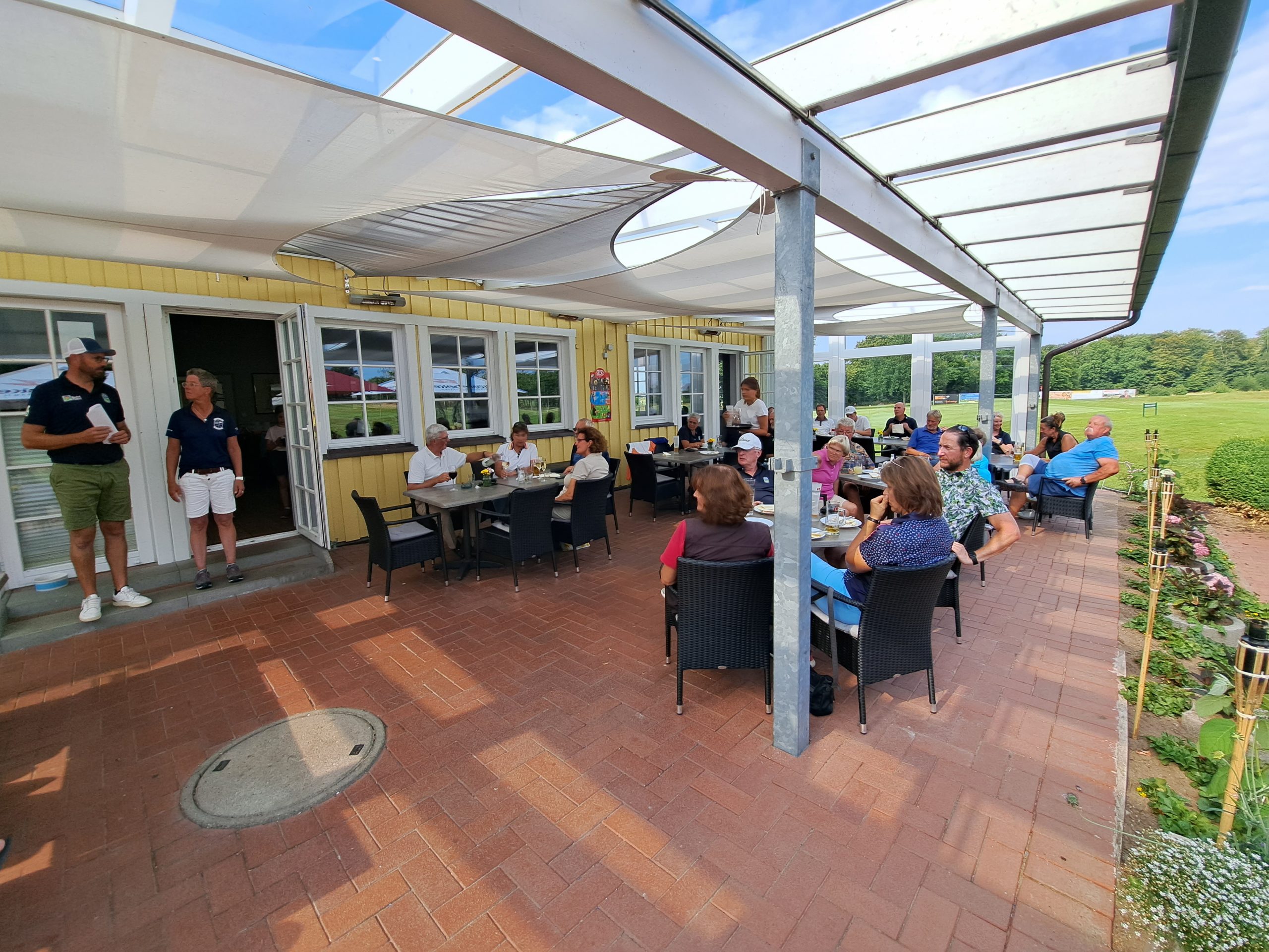Steffi, Mette und Thomas hatten in den Wertungen 1. bis 3. Brutto und Netto, sowie Longest Drive auf Bahn 1 und Nearest to the Pin auf Bahn 9 Preise ausgerufen. Bei wunderbarem, warmen Wetter ging’s um 12 Uhr per Kanonenstart auf die Runde 4er Texas Scramble.