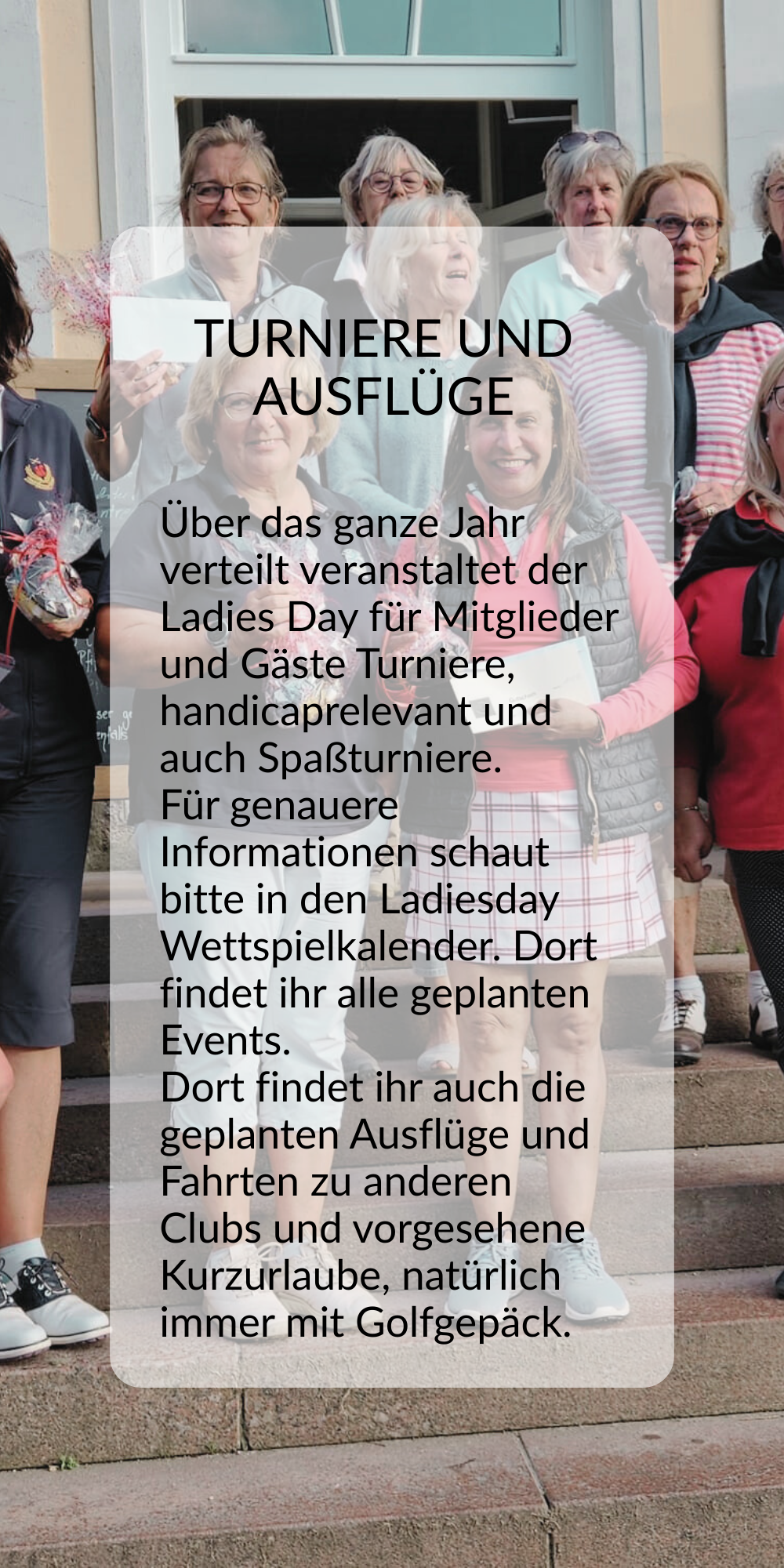 Weiterhin werden Turniere als „Ladies’ Day PLUS“ ausgetragen. Als besondere Turnierserie spielen wir die Ladies Sunshine Tour.